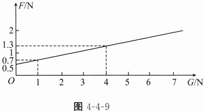 4. 在物理实验课上,小鹏利用滑轮组及相关器材进行实验。他把得到的拉力F(单位:N)和所悬挂物体的重力G(单位:N)的几组数据用电脑绘制成图4-4-9所示的图象(不计绳重和摩擦)。请你根据图象判断,下列结论中正确的是(
