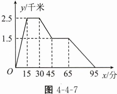 1. 图4-4-7中所反映的过程是:张强从家跑步去体育场,在那里锻炼了一段时间后,又去早餐店吃早餐,然后散步走回家。其中x表示时间,y表示张强离家的距离。根据图象提供的信息判断,下列说法中错误的是(