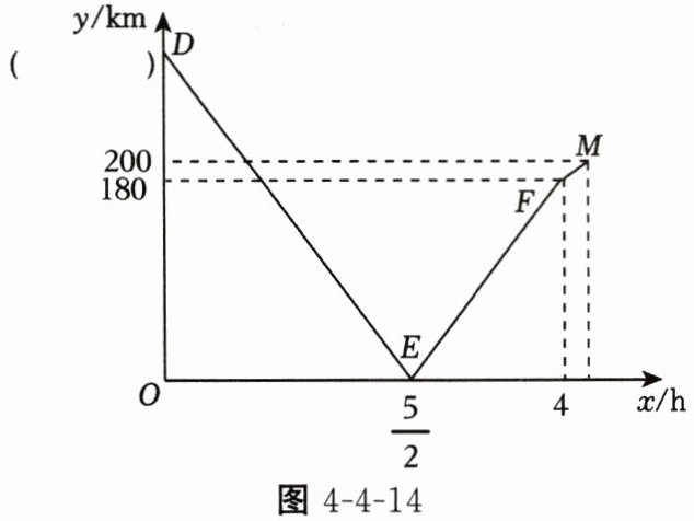 9. (2024·黑龙江牡丹江中考)一条公路上依次有A,B,C三地,甲车从A地出发,沿公路经B地到C地;乙车从C地出发,沿公路驶向B地。甲、乙两车同时出发,匀速行驶,乙车比甲车早2/7小时到达目的地。甲、乙两车之间的路程y(单位:km)与两车行驶时间x(单位:h)的函数关系如图4-4-14,请结合图象,解答下列问题。