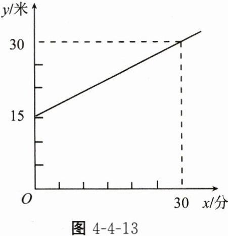8. (2023·四川甘孜州中考)在一个广场上同时释放两个探测气球。1号探测气球从距离地面5米处出发,以1米/分的速度上升,2号探测气球距离地面的高度y(单位:米)与上升时间x(单位:分)满足一次函数关系,其图象如图4-4-13。