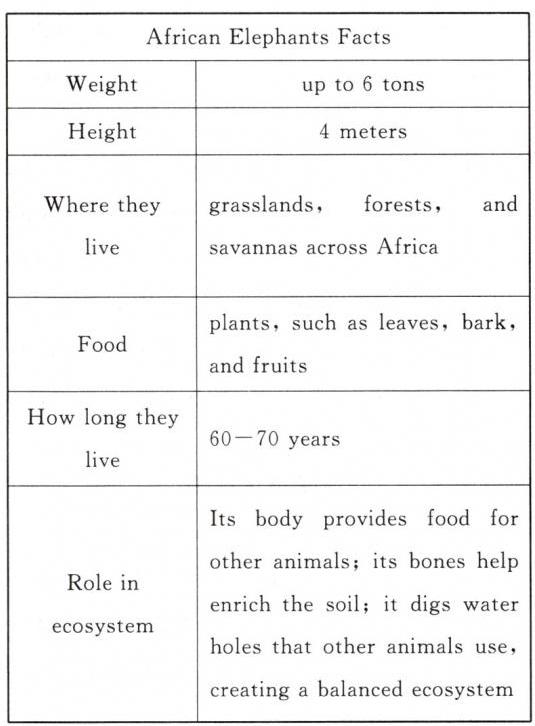 上面这篇文章从以下几个方面介绍了陆地上最大的动物非洲象:身高、体重、居住地、食物、寿命以及在生态系统中的作用等。使用了一般现在时,也出现了最高级。