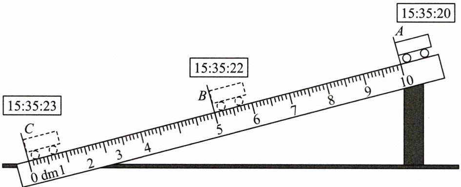 4. (2024·潍坊二模)小明在做“测小车的平均速度”实验中,设计了下图所示的实验装置:小车从长10dm带刻度的斜面顶端由静止下滑,图中的方框内显示的是小车到达A、B、C的时间。