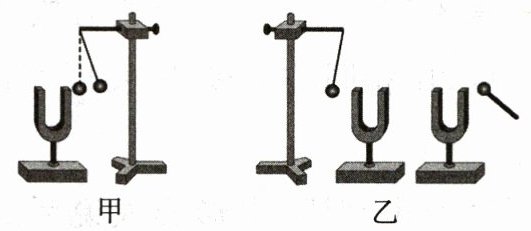 (选填“等效替代法”“转换法”或“控制变量法”)。如图乙所示,敲击右边的音叉,左边的音叉将乒乓球弹起,若图乙实验在月球表面进行,则左边的音叉不会