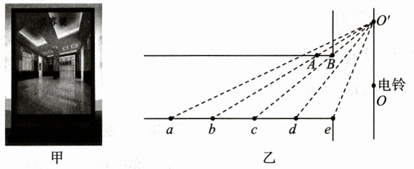 6. (2023·湖北武汉中考)一块仪容镜如图甲所示,放在某学校走廊的AB处,仪容镜靠墙而立,镜面与墙壁平行,在另一面墙壁上的O处悬挂一电铃,如图乙所示。为了总能看到电铃通过仪容镜所成的像O',小强同学沿着走廊的ae直线走动,若将人和电铃各自看作一个点,则小强同学所在的区间是(