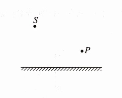 6. 请画出下图中 $ S $ 发出的光线经平面镜反射后过 $ P $ 点的光路。
