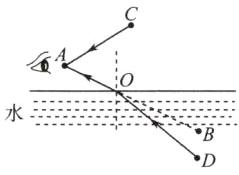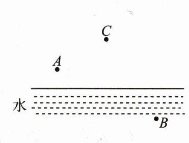 5. 小明站在池塘旁观赏游鱼,恰好看见一架飞机飞过。分别用 $ A $ 代表小明的眼睛、$ B $ 代表看到的鱼、$ C $ 代表看到的飞机(如下图所示),请画出小明看见鱼和飞机的光路图,并用“$ D $”大致标出鱼在池塘里的实际位置。(保留必要的作图痕迹)