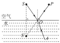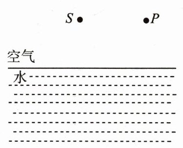 6. 如下图所示,空气中某点光源 $ S $ 发出一条光线射向水面,在水面发生反射和折射,反射光线经过 $ P $ 点。请在图中作出这条入射光线、对应的反射光线和折射光线的大致方向(保留作图痕迹)。