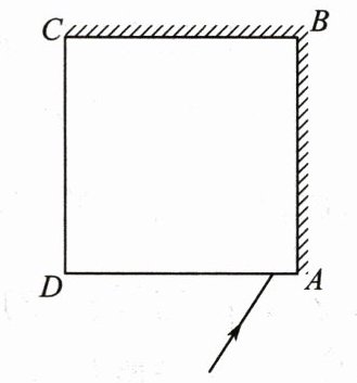 8. 下图所示的是一长方形玻璃砖 $ ABCD $,其中 $ AB $、$ BC $ 面涂有反射涂层,一条光线从 $ AD $ 面射入玻璃砖,请画出该光线进入玻璃砖后经过 $ AB $、$ BC $ 面的两次反射,并最终从 $ AD $ 面射出的光路图。