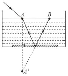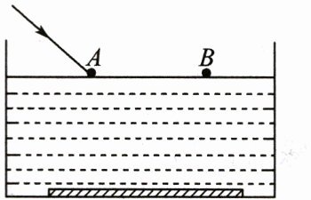 7. 如下图所示,在清水池底水平放置一平面镜,一束光射向水面的 $ A $ 点,经水折射和平面镜一次反射后射向水面的 $ B $ 点,请作出该过程的光路图。