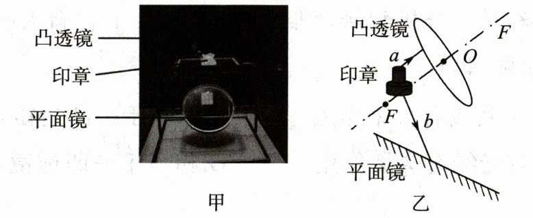 10. (2023·四川成都中考)图甲所示的是博物馆内“刘充国印”的展台,上方是凸透镜,透过它能看到放大的印章;下方是平面镜,透过它能看到印章底部的字。图乙是其示意图,F为凸透镜的焦点,O为凸透镜的光心,光线a平行于凸透镜的主光轴(图中虚线)。请在图乙中画出: