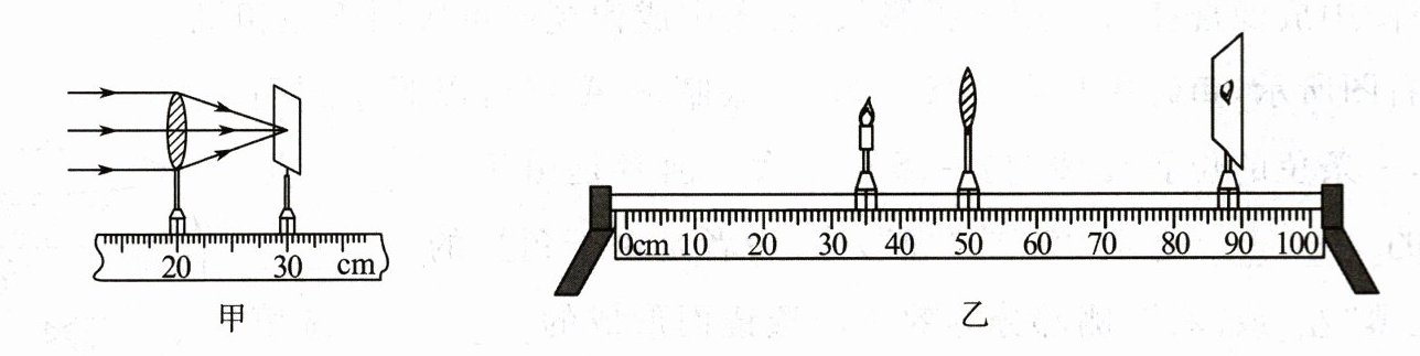 (1)如图甲所示,小滨让凸透镜正对平行光,调整凸透镜到光屏的距离,光屏上会出现一个很小、很亮的光斑,则该凸透镜的焦距$ f = $