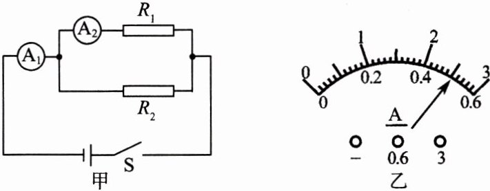 2. 如图甲所示,R₁、R₂两电热丝并联,已知R₁ = 20Ω,电源电压保持不变,闭合开关S后,电流表A₁和电流表A₂的表盘指针均指在图乙所示的位置。以下判断不正确的是(