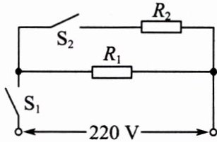5. (2025·江西模拟)下图是某款家电的简化电路图,R₁、R₂为阻值一定的电阻,R₁ = 550Ω,R₂ = 44Ω。该用电器接入电压恒为220V的电路中。