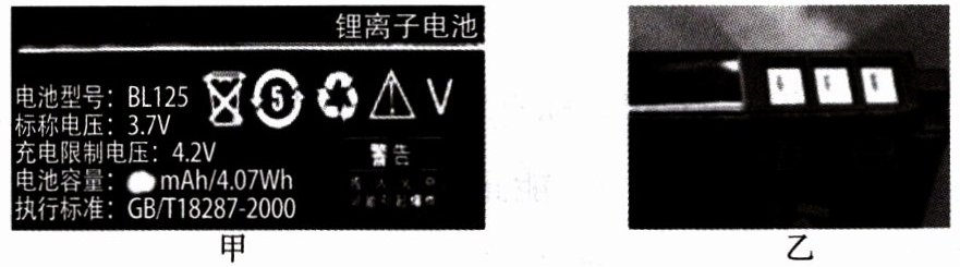 3. 下图甲所示的是某品牌手机的电池,“mAh”看不清了,但发现了4.07Wh字样,此电池在充满电时贮存的电能为