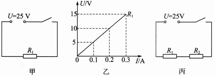 (3)如图丙所示,再将定值电阻R₂和R₁串联,接在25V的电源两端,闭合开关时,测得R₂两端的电压为15V,此时R₂的电功率是多少?