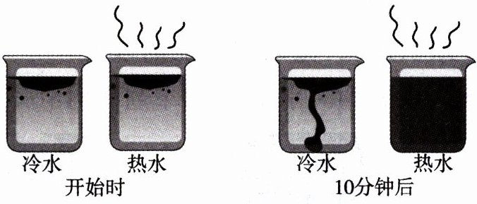2. (2023·四川成都中考)把两滴墨水分别同时滴入盛有冷水和热水的两个玻璃杯中,实验过程及现象如右图所示。分析可知,物体的温度越高,分子的无规则运动越