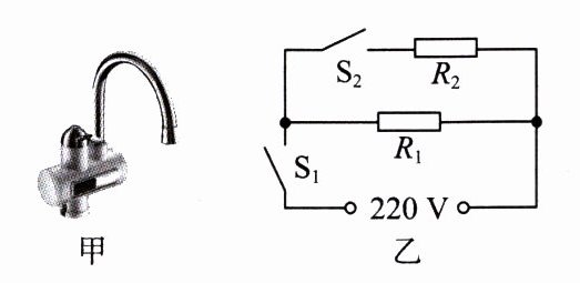 5.(2023·四川雅安中考)图甲是某款即开即热、冷热兼用的电热水龙头,图乙是它的工作原理简化电路图。$R_{1}$、$R_{2}$为电热丝,通过闭合或断开开关$S_{1}$、$S_{2}$,实现冷水、温水、热水之间的切换,有关参数见下表。
