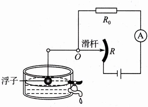 7. 下图所示的是一种测定油箱内油量的装置,其中 $ R $ 是滑动变阻器的电阻片,滑动变阻器的滑片跟滑杆可以绕固定轴 $ O $ 转动,另一端固定着一个浮子。当油箱中的油量减少时(