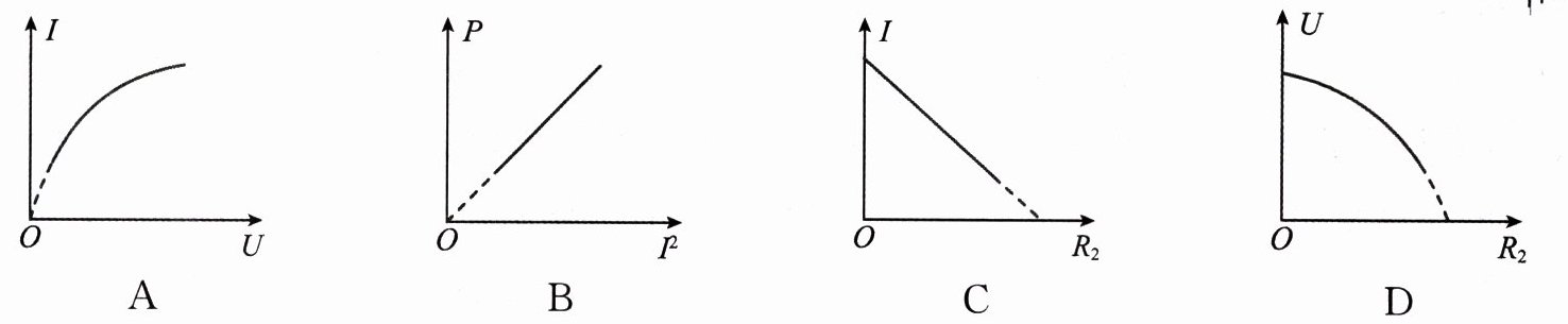 9. (2023·江苏淮安中考)右图所示的电路中,电源电压恒定,$ R_1 $ 为定值电阻,$ R_2 $ 为电阻箱。闭合开关,调节 $ R_2 $ 的阻值,下列关于电流表的示数 $ I $、电压表的示数 $ U $、$ R_1 $ 的功率 $ P $ 及 $ R_2 $ 的阻值之间的关系图像正确的是(