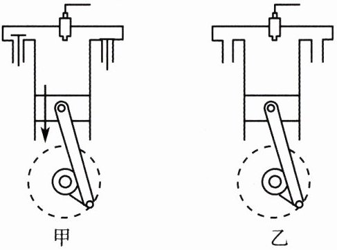 21. 如下图所示,甲为四冲程汽油机的吸气冲程示意图,请在乙图中用“T”表示阀门,画出做功冲程进气门、排气门的开闭情况,用“↓”或“↑”表示活塞运动方向。