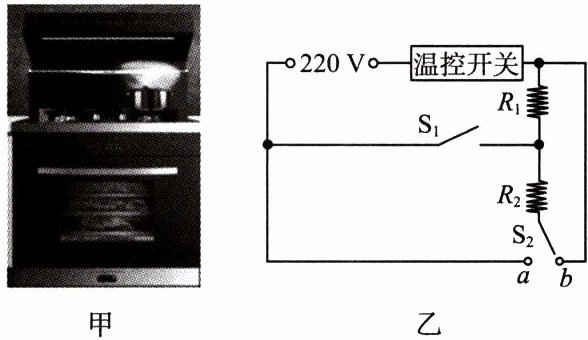 1. (2024·德州中考)图甲是一款家用蒸箱,图乙是其加热盘模块的简化电路,蒸箱有“低温”“中温”“高温”三挡,其中 $ R_1 $、$ R_2 $ 为阻值不变的电热丝,当开关 $ S_1 $ 断开、$ S_2 $ 接 $ a $ 时,蒸箱处于