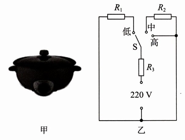 2. (2024·黑龙江中考)一款小型电火锅如图甲所示,通过挡位开关实现高、中、低三挡控温功能;图乙是它的简化电路图。$ R_1 $、$ R_2 $、$ R_3 $ 均为加热电阻(阻值保持不变),已知 $ R_1 $ 的阻值为 $ 176 \ \Omega $,电火锅的部分参数如下表所示。