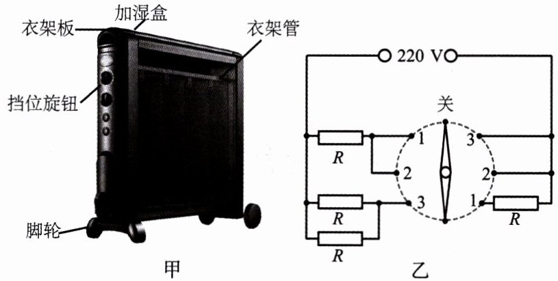 3. (2023·东营中考)小明家购置了一款多功能电暖器,如图甲所示,其内装有 $ 4 \ kg $ 导热油,转动旋钮可实现高、中、低不同挡位之间的切换,图乙是其内部电路原理图,其中四个发热电阻的阻值相同。