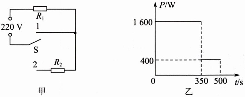 5. 某家用电热水壶有加热和保温两挡,内部电路简化示意图如下图甲,其中 $ R_1 $ 和 $ R_2 $ 均为阻值不变的发热电阻。某次使用该电热水壶烧水过程中,电路的电功率随时间变化的图像如图乙所示。求: