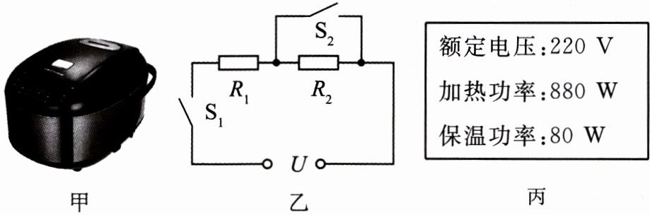 (3)由题图乙可知,当开关S₁闭合、S₂断开时,R₁、R₂串联,根据串联电路的电阻特点可知,此时电路中的总电阻最大,由$P=\frac{U^2}{R}$可知,电路中的总功率最小,电饭锅处于保温挡;当开关S₁、S₂都闭合时,只有R₁工作,电路中的总电阻最小,由$P=\frac{U^2}{R}$可知,电路的总功率最大,电饭锅处于加热挡,R₁的阻值