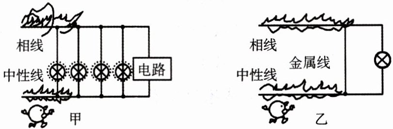 3. 在下图所示的甲、乙两个电路中,开关闭合后,电线燃烧起来。甲产生的原因是______,乙产生的原因是______。为了减少雷电造成的损失,高大建筑物上必须安装______装置。