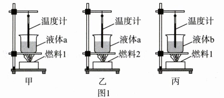 $J/(kg·^{\circ}C)$。(2)为了研究不同燃料的热值,利用其中______(选填“甲”“乙”或“丙”)两图进行实验。实验时发现:两种燃料完全燃烧完了,在这之前液体 a 都沸腾了,你能否比较出两种燃料的热值?______(选填“能”或“不能”)。为避免这种情况的出现,你可以对他们组提出什么改进建议?_。