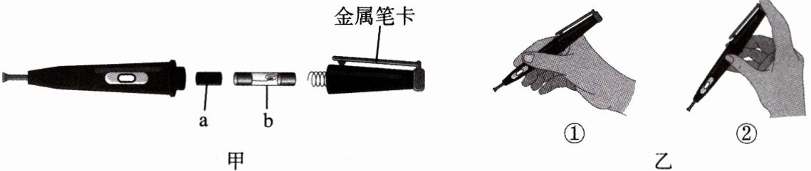 (选填“串联”或“并联”);在使用测电笔时,图乙中正确的握法是②