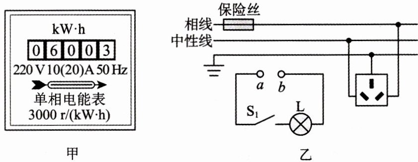 5. (2024·德州中考)小强家安装的电能表如图甲所示,书房灯L及三孔插座的安装电路如图乙所示,为保证安全用电,下列说法正确的是(