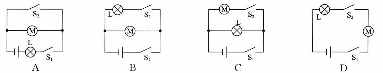 7.(2025·江苏镇江丹徒区模拟)骑电动自行车时不戴头盔存在安全隐患,为了达到骑行共享电动自行车必戴头盔的目的,张明同学设计了以下改进方案:骑行前,扫码成功后开关 $ S_1 $ 闭合,指示灯 $ L $ 亮,但电机不工作;从车头取出头盔并戴上后,头盔内遥控设备遥控开关 $ S_2 $ 闭合,电动机才通电工作;若只戴头盔不扫码,则无法骑行。下列电路符合以上设计要求的是(