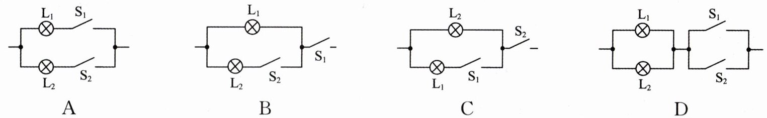 8.(2023·安徽中考)老师给小龙一个密封盒,其表面可见两个开关 $ S_1 $、$ S_2 $ 和两盏灯 $ L_1 $、$ L_2 $。为了探究开关和灯在密封盒内是如何连接的,小龙进行了如下操作:先闭合 $ S_1 $,只有灯 $ L_1 $ 发光;又闭合 $ S_2 $,两灯都发光;再断开 $ S_1 $,两灯都熄灭。符合上述实验结果的连接方式为(