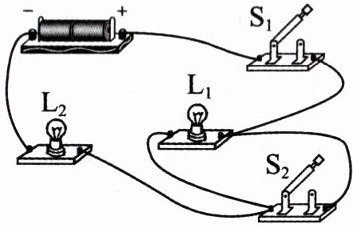 9.(2022·江苏淮安中考)如右图所示,闭合开关 $ S_1 $,电灯 $ L_1 $、$ L_2 $ 都能发光。再闭合开关 $ S_2 $,观察到灯泡的发光情况是(
