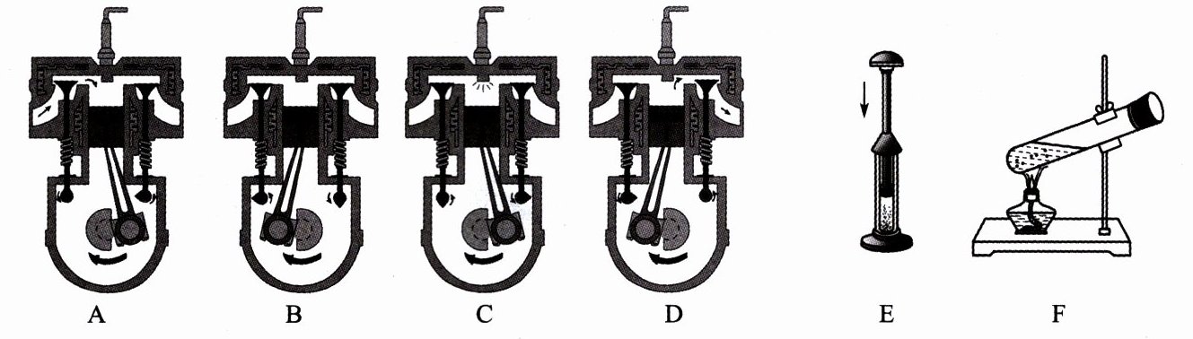 9.(2023·四川自贡中考)如下图所示,图A、B、C、D是四冲程汽油机的工作示意图,图E、F是演示实验的示意图。B图是