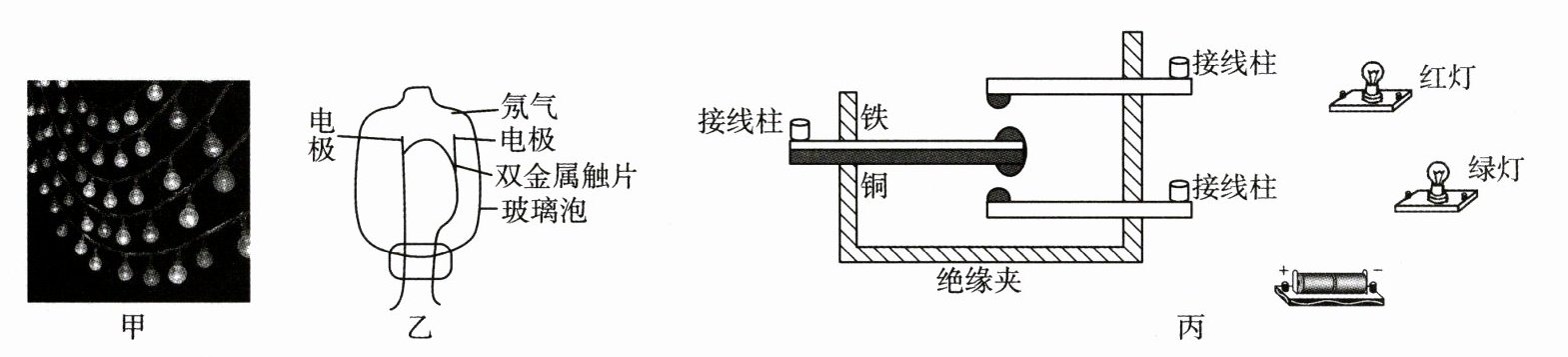 图乙所示的为“跳泡”的结构图,“跳泡”主要由充有氖气的玻璃泡、双金属触片、两个电极组成。双金属触片是由长和宽相同的铜片和铁片组成的,且两金属片被紧紧地铆在一起,受热时铜片膨胀得比铁片大,双金属触片便向铁片那边弯曲。氖气的导电效果比双金属触片差得多,但通电后的热效应好,易产热。当彩灯电路未接通时,双金属触片与两个电极之间断开;接通电路后,“跳泡”内的电极之间产生了高压可以击穿氖气导电,彩灯发光,同时氖气导电时发热,引起“跳泡”内的双金属触片受热弯曲与两个电极接触,彩灯熄灭,“跳泡”里的氖气不再导电,氖气的温度迅速下降,双金属触片恢复原状导致两电极分离,此刻两电极之间又产生高压而击穿氖气导电,使彩灯发光。如此循环工作,彩灯就会不停地闪烁。