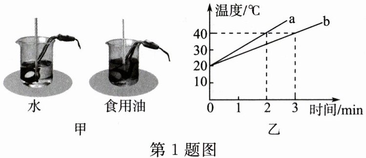 1. 如图甲所示,小君使用相同规格的电加热器和烧杯分别对水和食用油加热,得到温度随时间变化的图像如图乙所示,水的比热容 $ c_{水} = 4.2 × 10^{3} \, J/(kg \cdot ℃) $,下列说法正确的是(