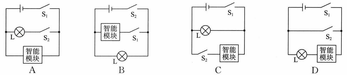 7. (2024·江苏无锡一模)有一款智能镜子,其工作原理如下:当用户靠近时,传感器开关 $ S_{1} $ 闭合,灯泡 L 工作;用户发声后,开关 $ S_{2} $ 闭合,智能模块启动,用户开始体验智能化生活。下列电路设计符合要求的是(