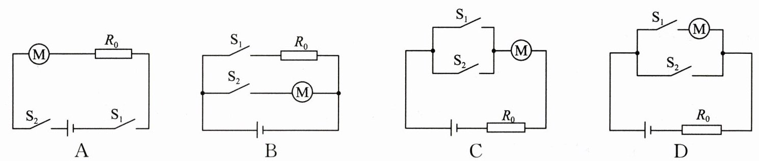 4. (2024·青岛开学考试)某学校门口设置了人脸识别测温系统。若人脸识别通过,则控制电路会闭合开关 $ S_{1} $;若体温测量值在正常范围内,则会闭合开关 $ S_{2} $。只有人脸识别通过且体温在正常范围内,系统才会启动电动机打开闸门。下列设计的电路能实现上述功能的是(