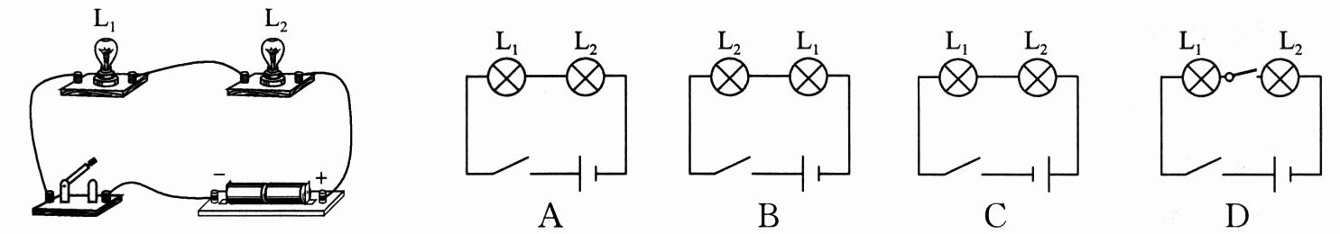 3. 如右图所示,在“组成串联电路”实验中,当开关 $ S $ 闭合时,灯 $ L_1 $、$ L_2 $ 均不亮。某同学用一根导线去检查电路的故障:他将导线先并联接在灯 $ L_1 $ 两端时发现灯 $ L_2 $ 亮,灯 $ L_1 $ 不亮;然后将导线并联接在灯 $ L_2 $ 两端时发现两灯均不亮。由此可以判断(