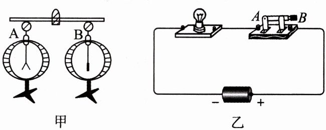 7. 验电器带电情况如图甲所示,用带绝缘柄的金属棒把两个验电器连接起来;在图乙所示的电路中,灯泡正常发光。根据图中信息可以判断出(