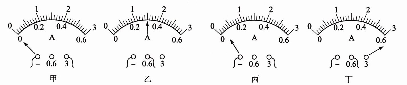 偏转,无法读数,且容易损坏电流表。(3)分析丙、丁两图中的现象可知,图丙中电流表所选测量范围