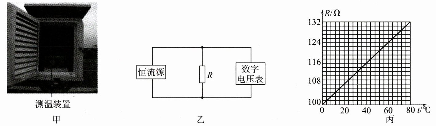 10.(2024·北京中考)图甲为某自动气象站中的测温装置,它的测温电路可简化为图乙,其中的“恒流源”是一个特殊电源,电流大小由电源内部结构决定,当电阻 $ R $ 变化时,通过 $ R $ 的电流大小保持不变。电阻 $ R $ 的阻值随温度的变化规律如图丙所示,通过数字电压表的示数可反映环境的温度。某次环境温度从 $ 20\ \celsius $ 上升到 $ 30\ \celsius $,电压表的示数变化了 $ 8\ mV $。当温度的变化值相同时,电压表示数的变化值越大,该测温装置的灵敏度越高。下列说法正确的是(