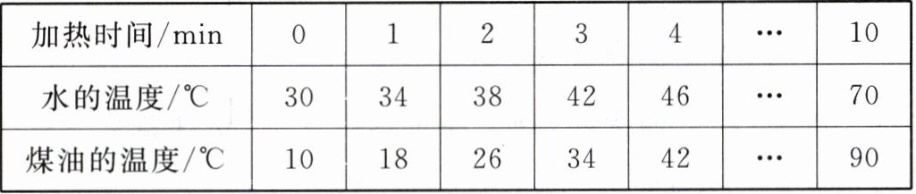 相同的水和煤油,分别倒入烧杯中,用电加热器加热,当它们吸收相同的热量时,通过比较升高的温度