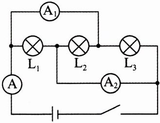 9. 如下图所示,已知电流表A的示数为1.5A,电流表A₁的示数为0.8A,电流表A₂的示数为1.2A,则流过L₁、L₂、L₃的电流分别为多少?