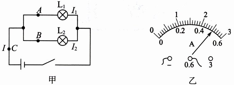 (4) 测出了L₁、L₂支路和干路上的电流,其中I₂ = 0.4A,I = 0.9A。I₁的示数如图乙所示,可读出I₁ =