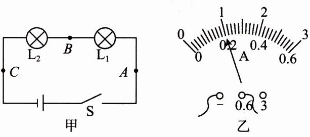 (1) 为了验证猜想一,小桂用电流表分别测出图甲A、B、C三处的电流,电流表的示数均如图乙所示,为