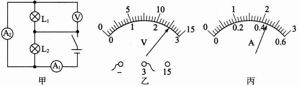 例 3 下图所示的电路中,电压表示数如图乙,A₁、A₂ 两电表示数如图丙所示,则通过 L₂ 的电流为